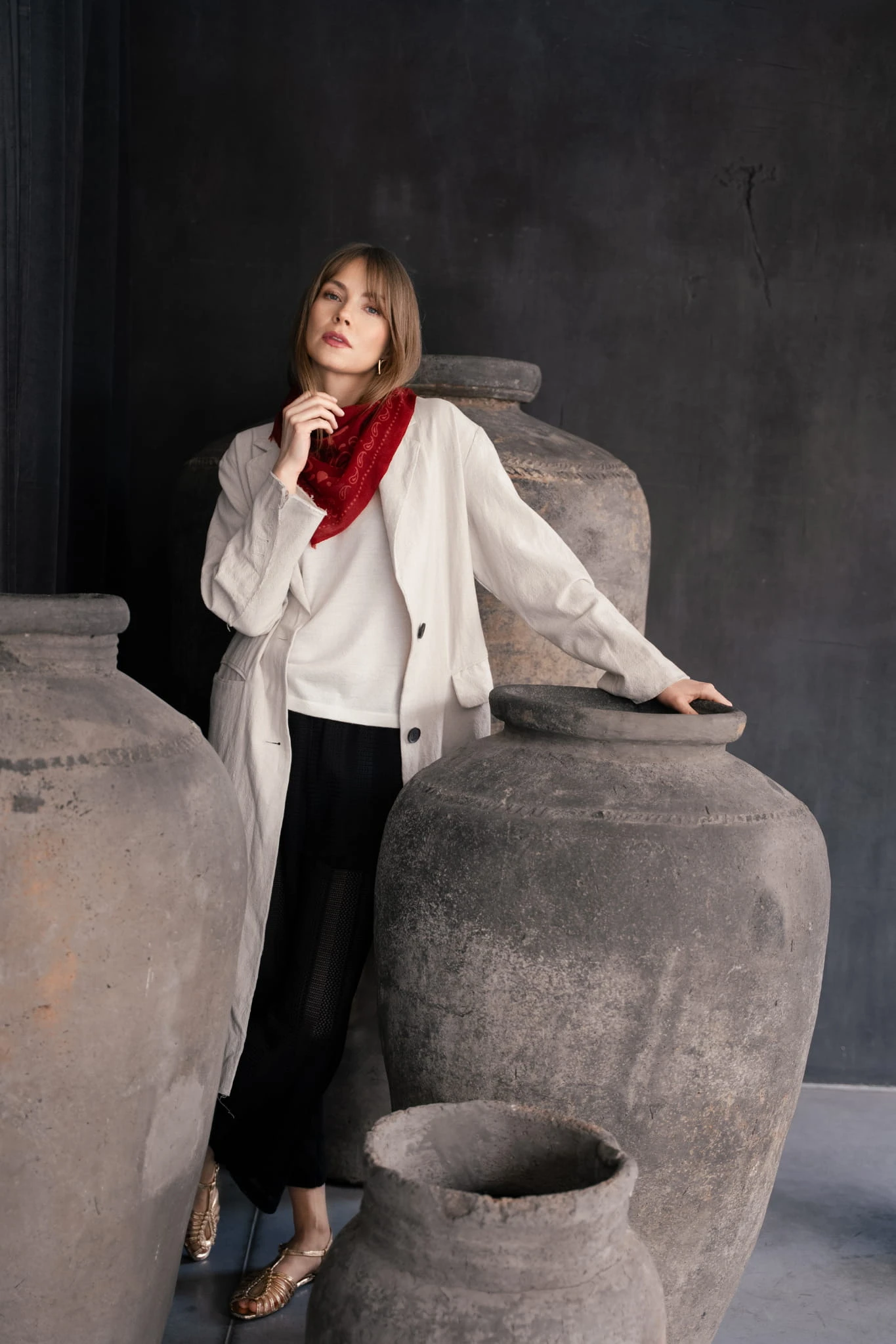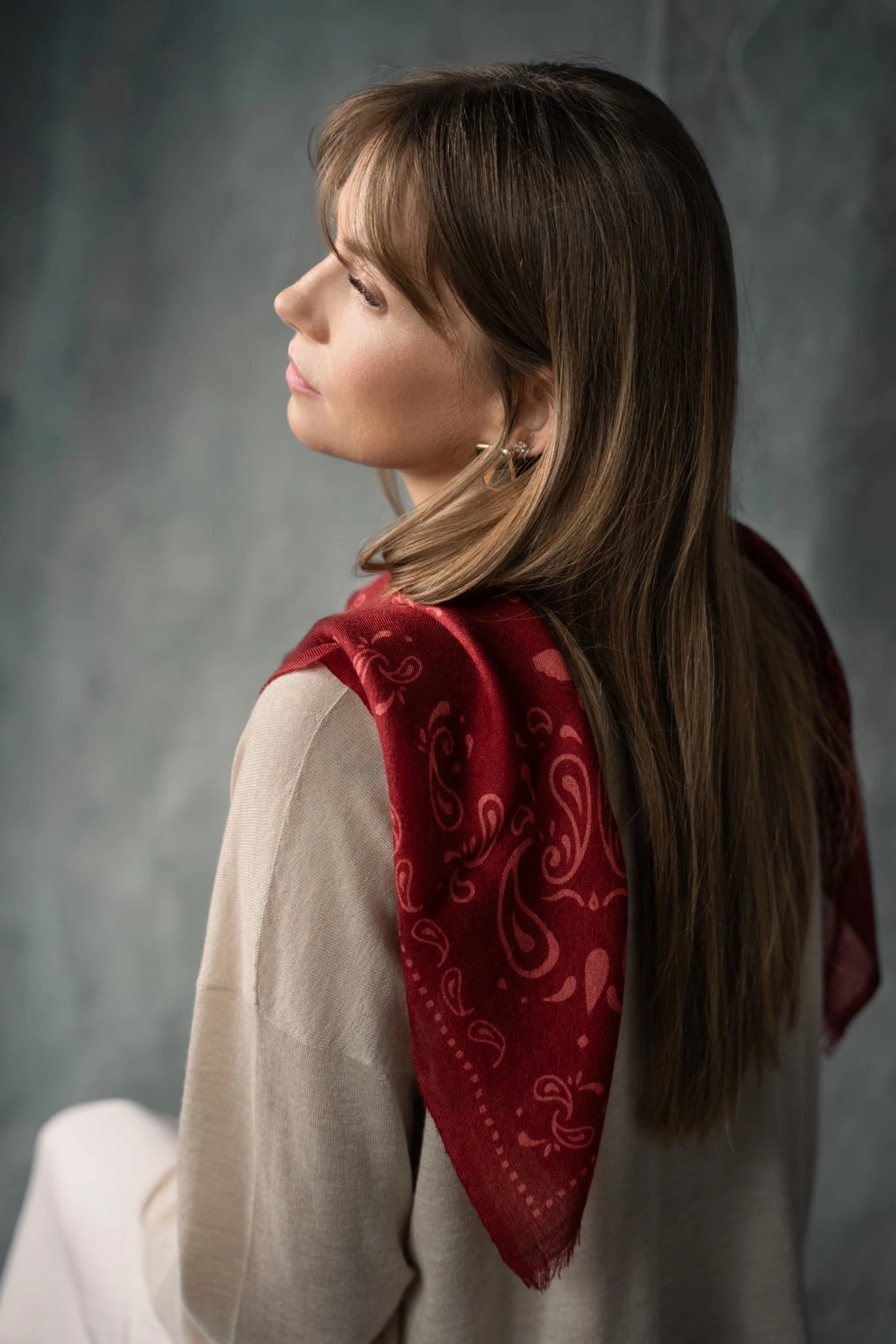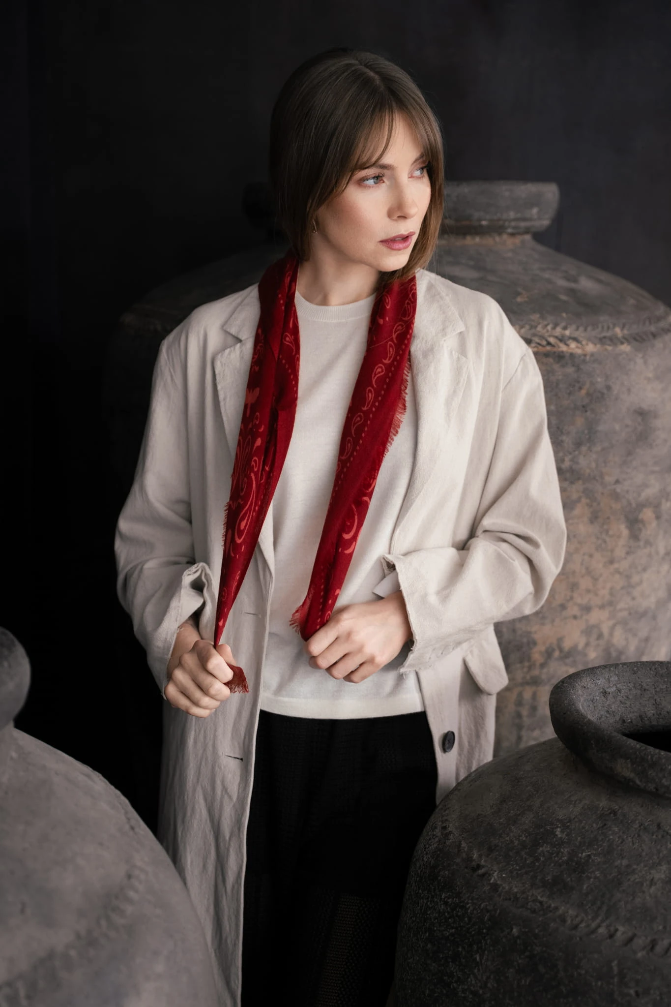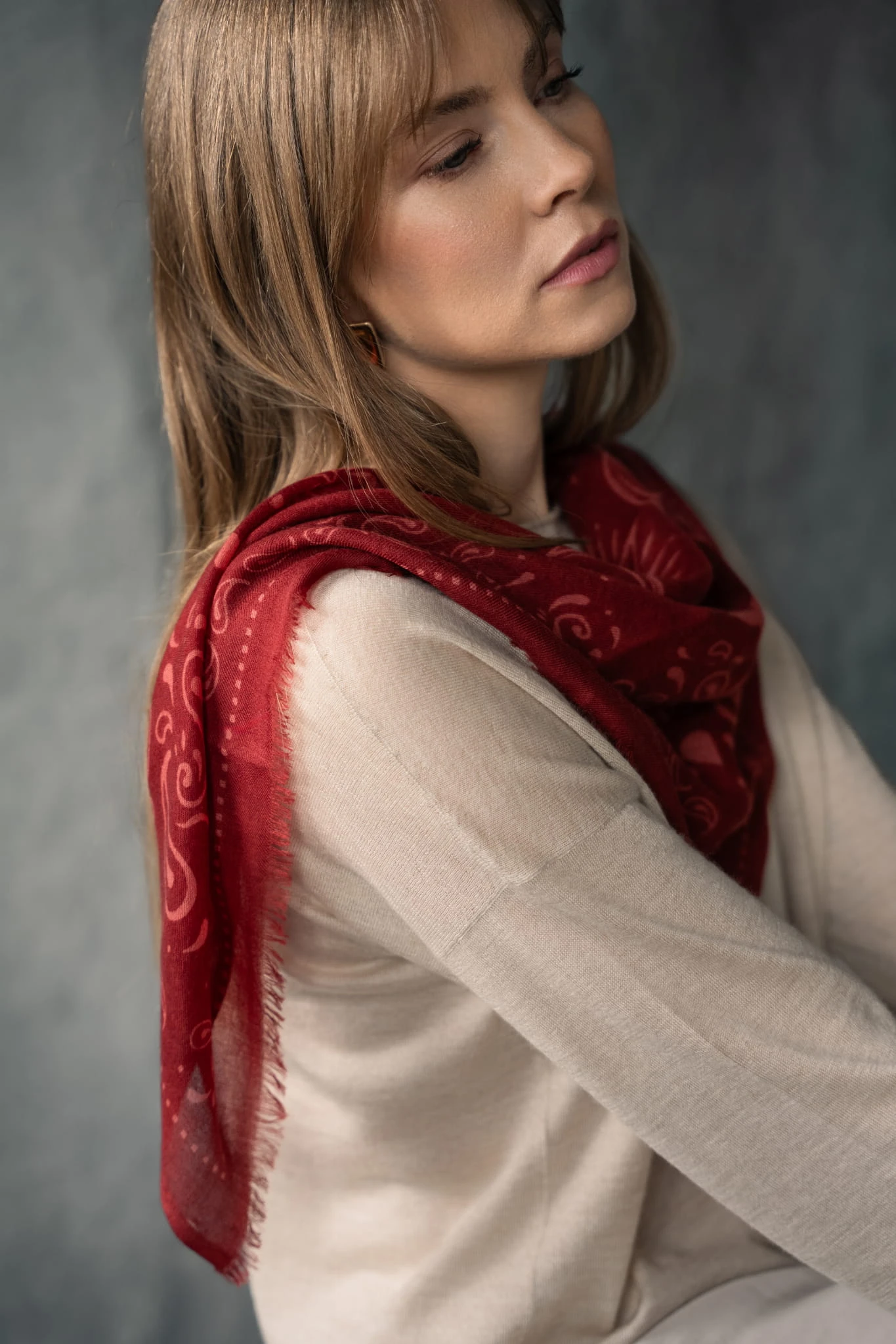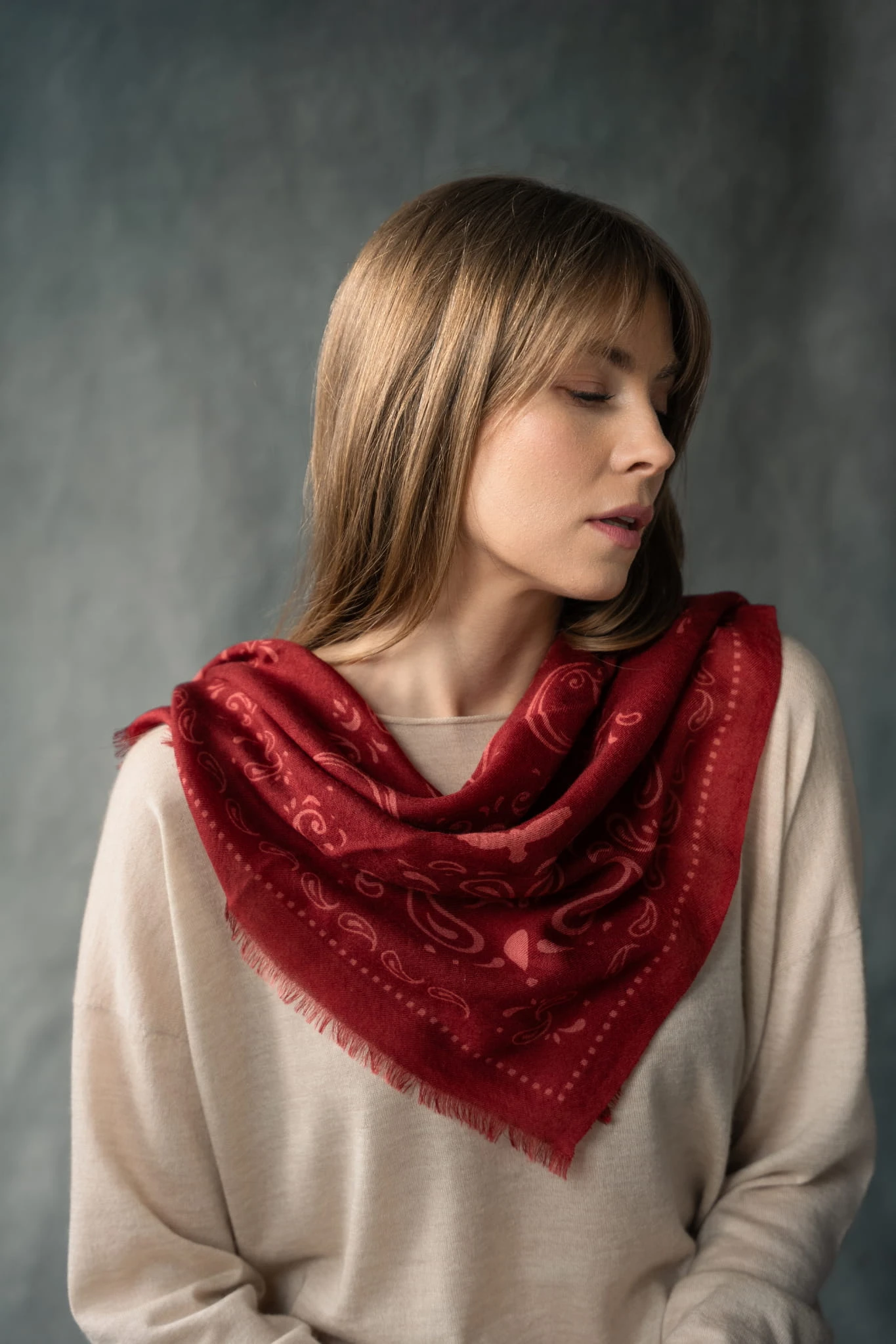 Wykonana z cienkiego, tkanego kaszmiru pozostaje niemal niewyczuwalna na skórze. Miękko układa się wokół szyi, dodając stylizacji lekkości i swobody, bez uczucia ciężaru. Ta lekkość naprawdę Cię zaskoczy.