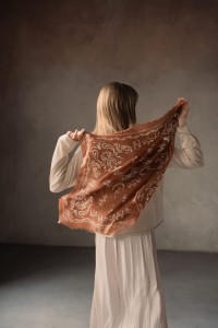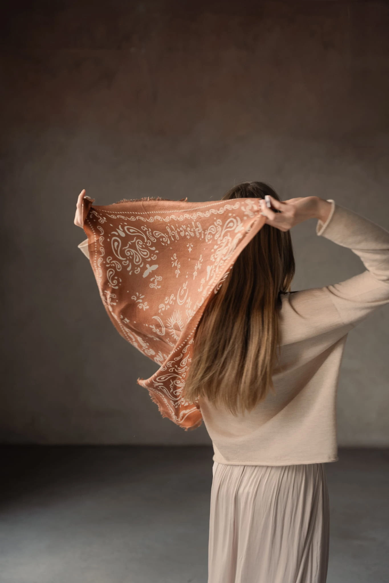 Autorski wzór nanoszony ręcznie metodą "hand screen print" nadaje jej unikalnego charakteru. Każda chusta powstaje w pracowni w Nepalu, gdzie liczy się precyzja i detal.