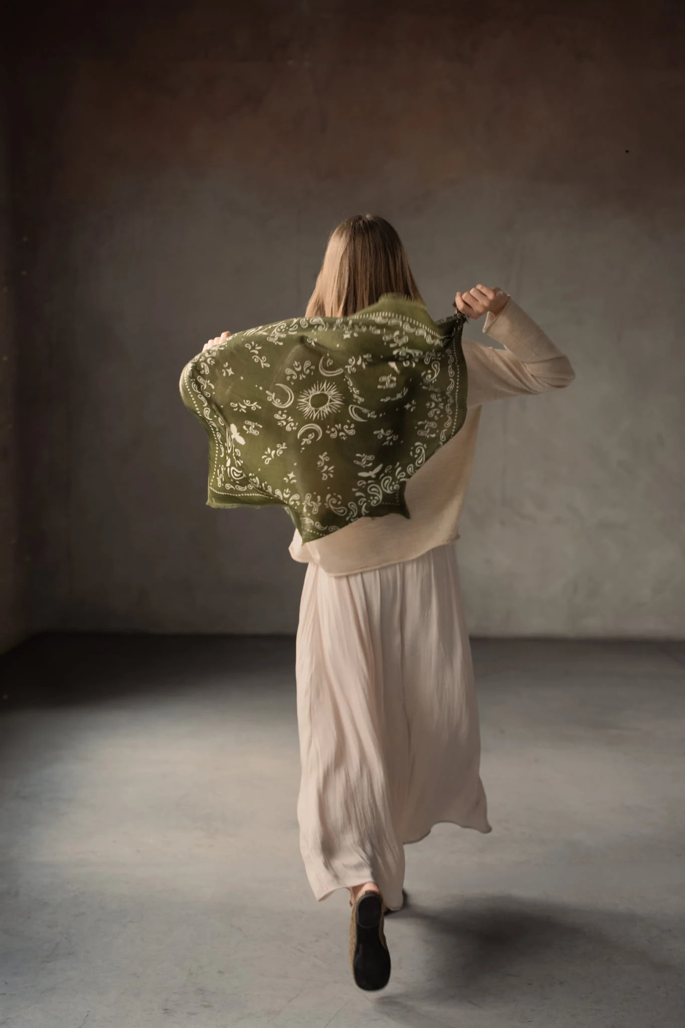 Autorski wzór nanoszony ręcznie metodą "hand screen print" nadaje jej unikalnego charakteru. Każda chusta powstaje w pracowni w Nepalu, gdzie liczy się precyzja i detal.