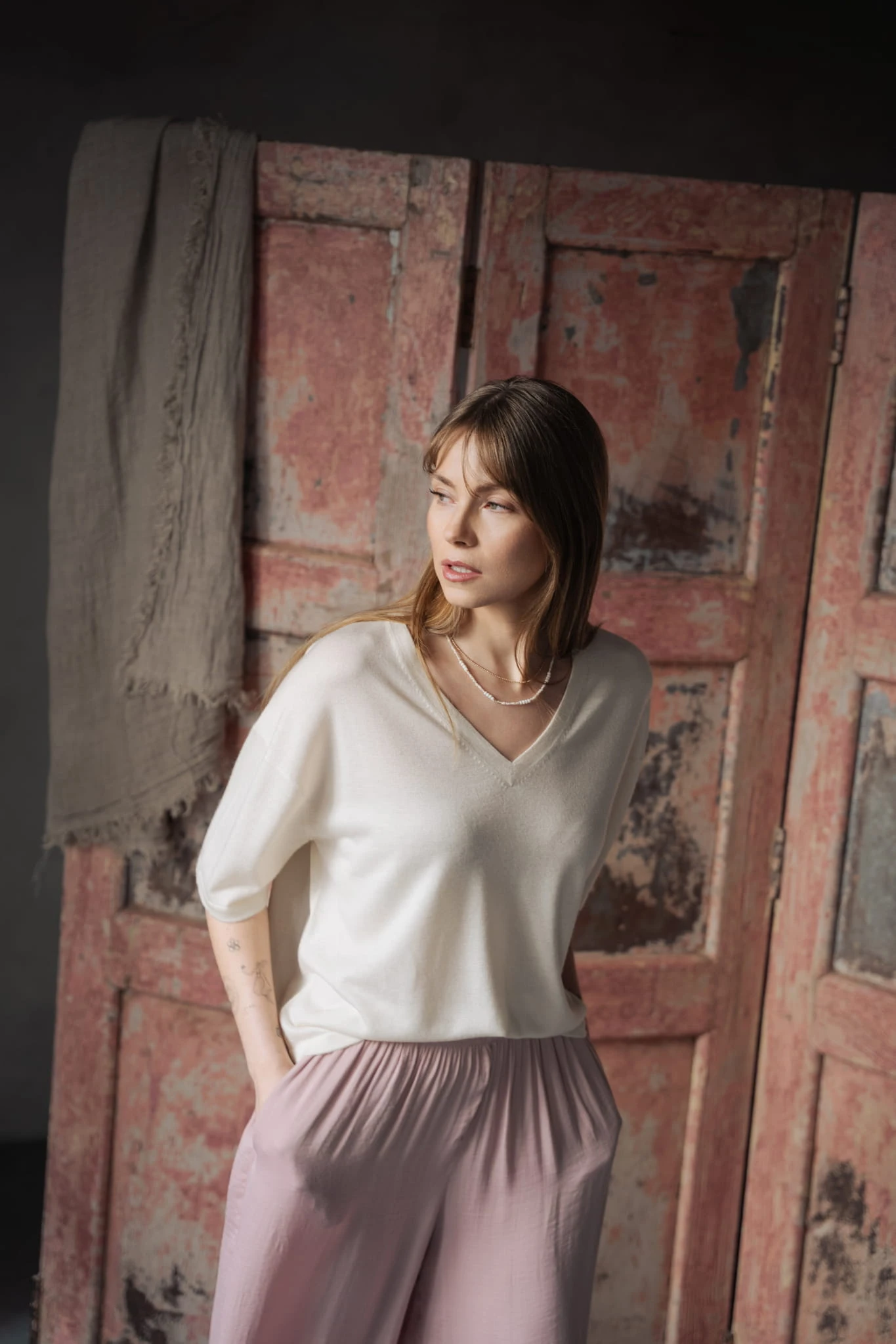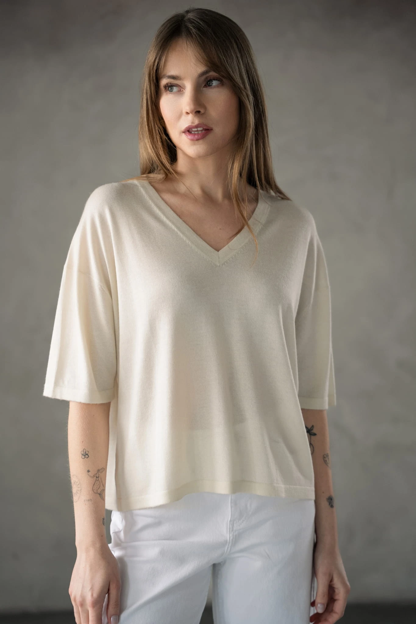 Lekki T-shirt jedwab-kaszmir, ecru