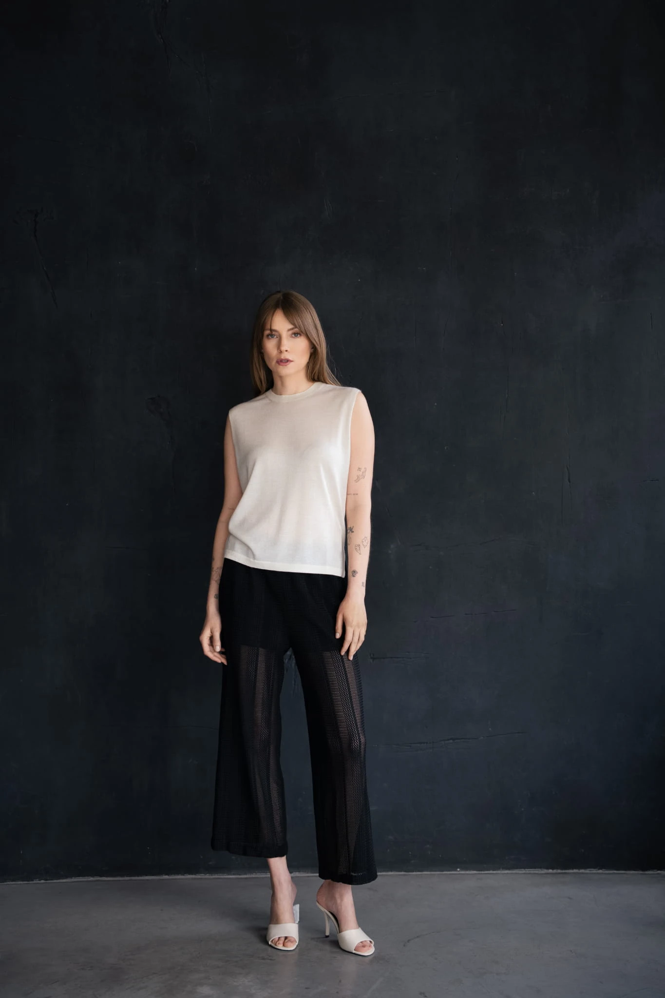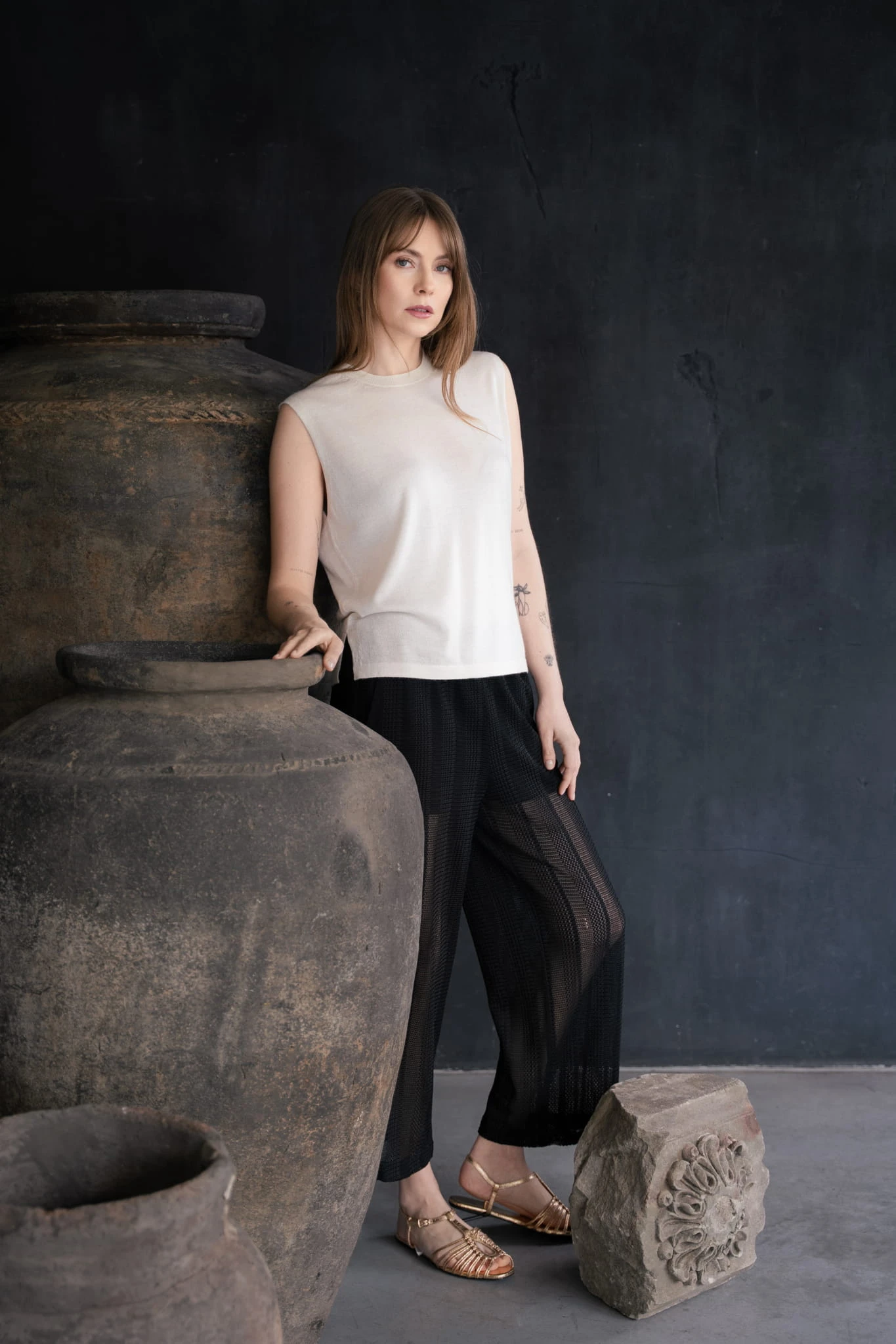 Ten model powstał z cienkiej przędzy kaszmirowo-jedwabnej o gładkiej, uporządkowanej strukturze.