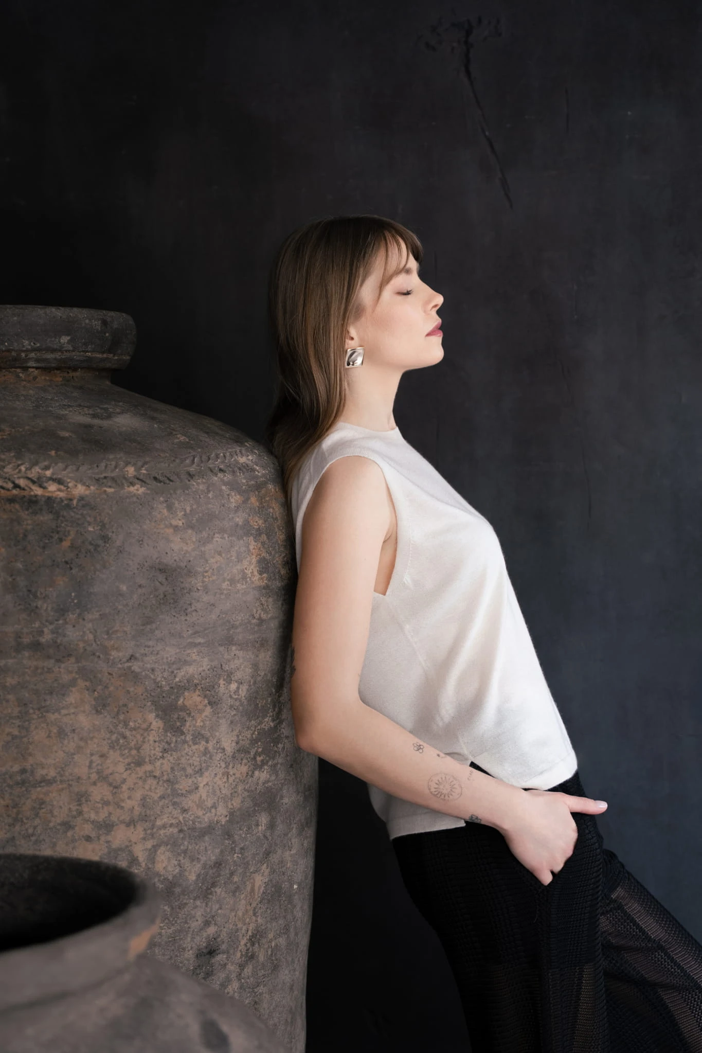 Dzianina ma gładką, uporządkowaną strukturę, dzięki czemu jest bardziej płynna i mniej puszysta niż klasyczny kaszmir. W połączeniu z jedwabiem staje się lżejsza, bardziej przewiewna i nie zatrzymuje ciepła w typowy sposób. Materiał jest delikatny w odbiorze, z subtelnym kontaktem ze skórą i bez uczucia ciężaru.