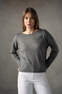 Ten model powstał z cienkiej przędzy kaszmirowo-jedwabnej o gładkiej, uporządkowanej strukturze.