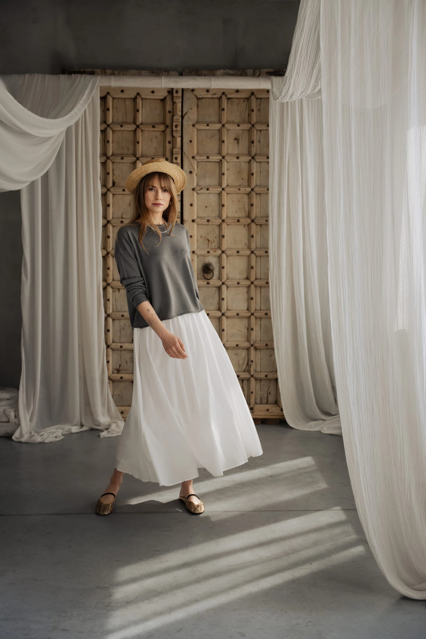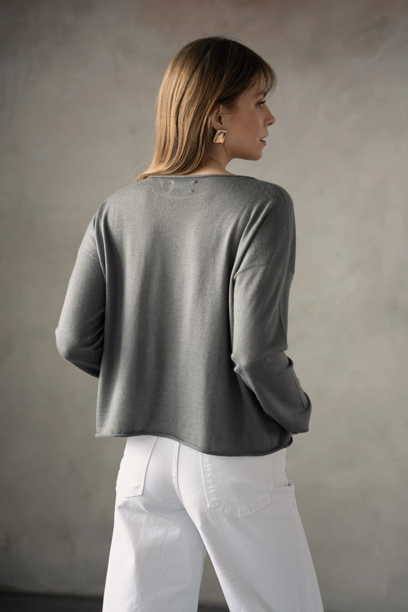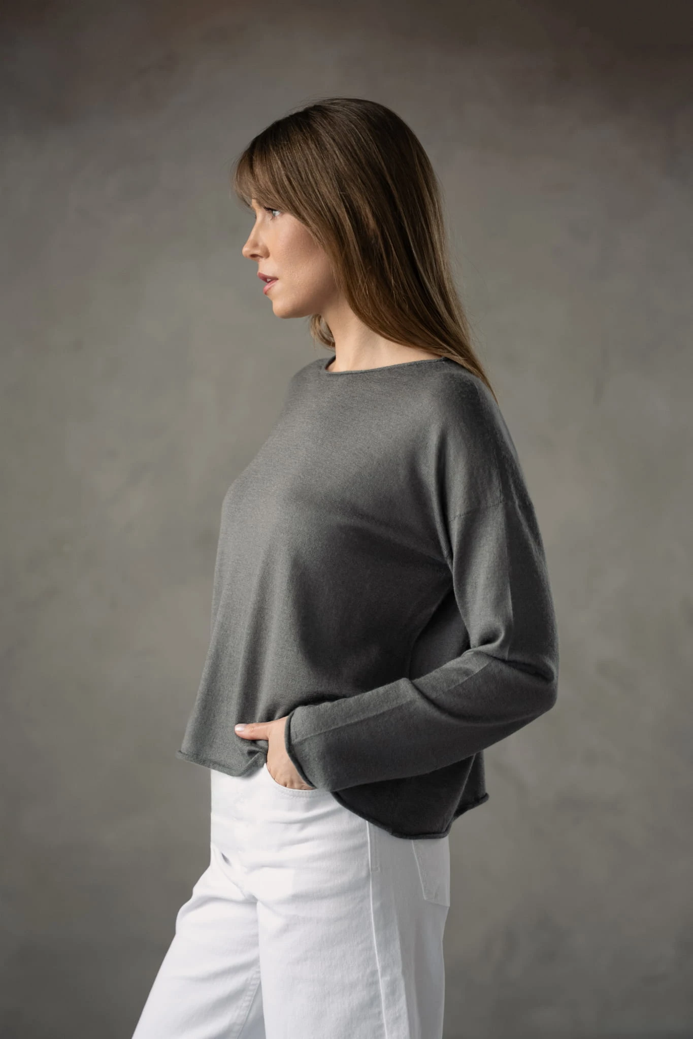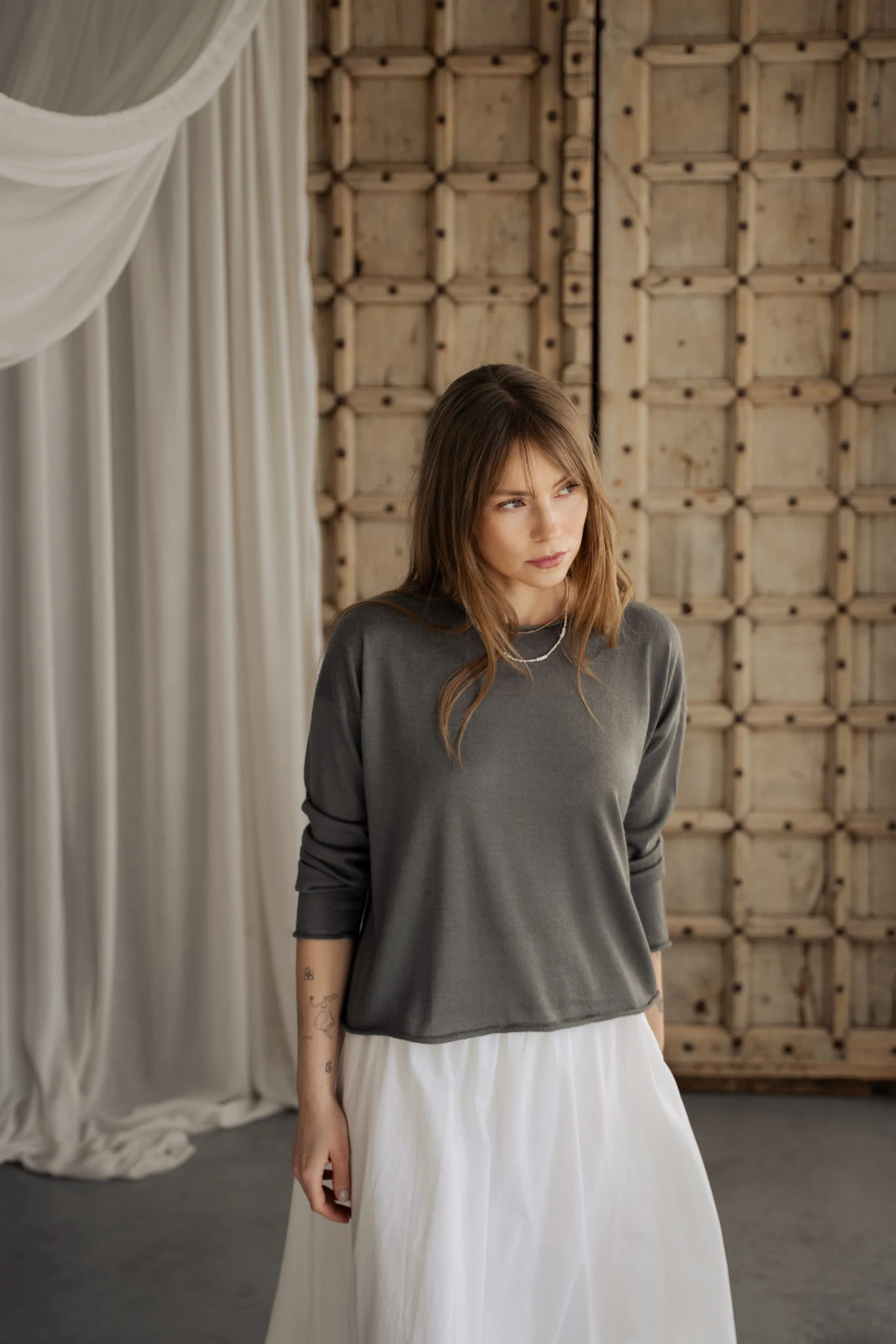 Dzianina ma gładką, uporządkowaną strukturę, dzięki czemu jest bardziej płynna i mniej puszysta niż klasyczny kaszmir. W połączeniu z jedwabiem staje się lżejsza, bardziej przewiewna i nie zatrzymuje ciepła w typowy sposób. Materiał jest delikatny w odbiorze, z subtelnym kontaktem ze skórą i bez uczucia ciężaru.